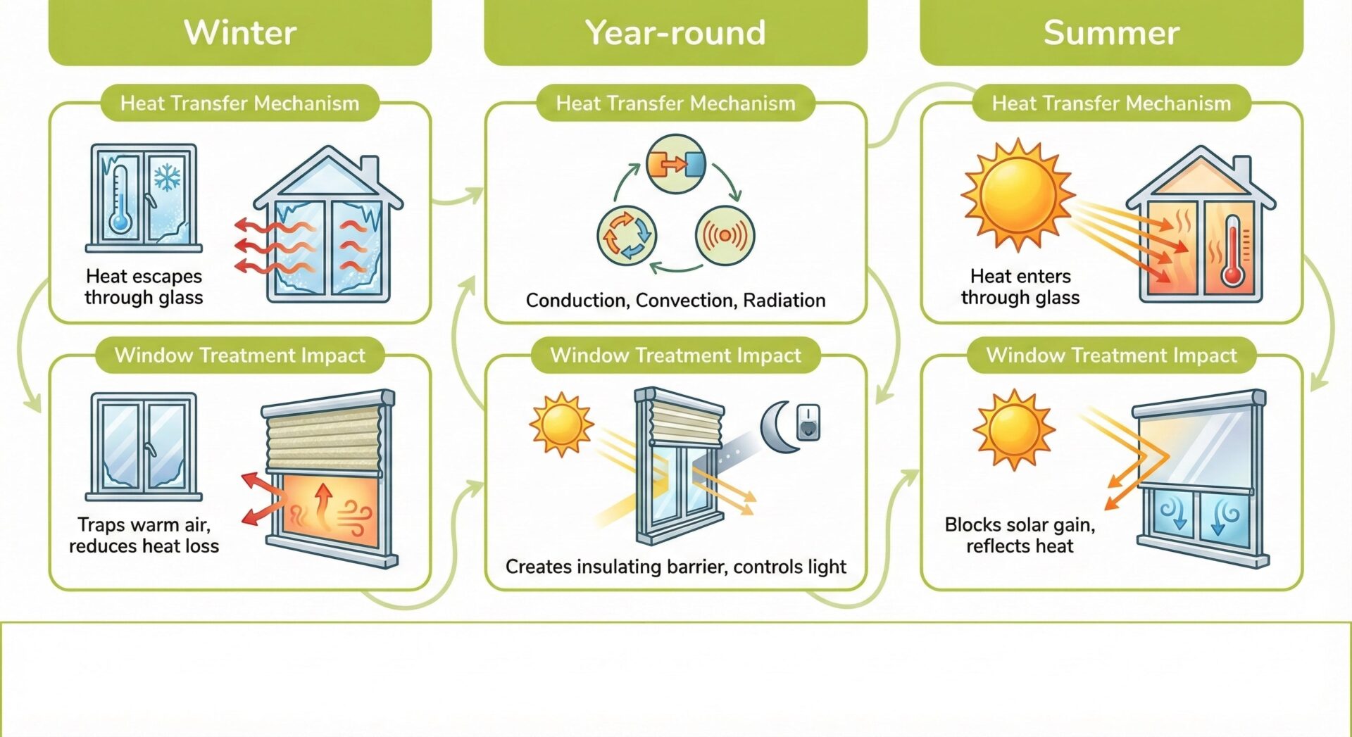 | Season | Heat Transfer Mechanism | Window Treatment Impact |