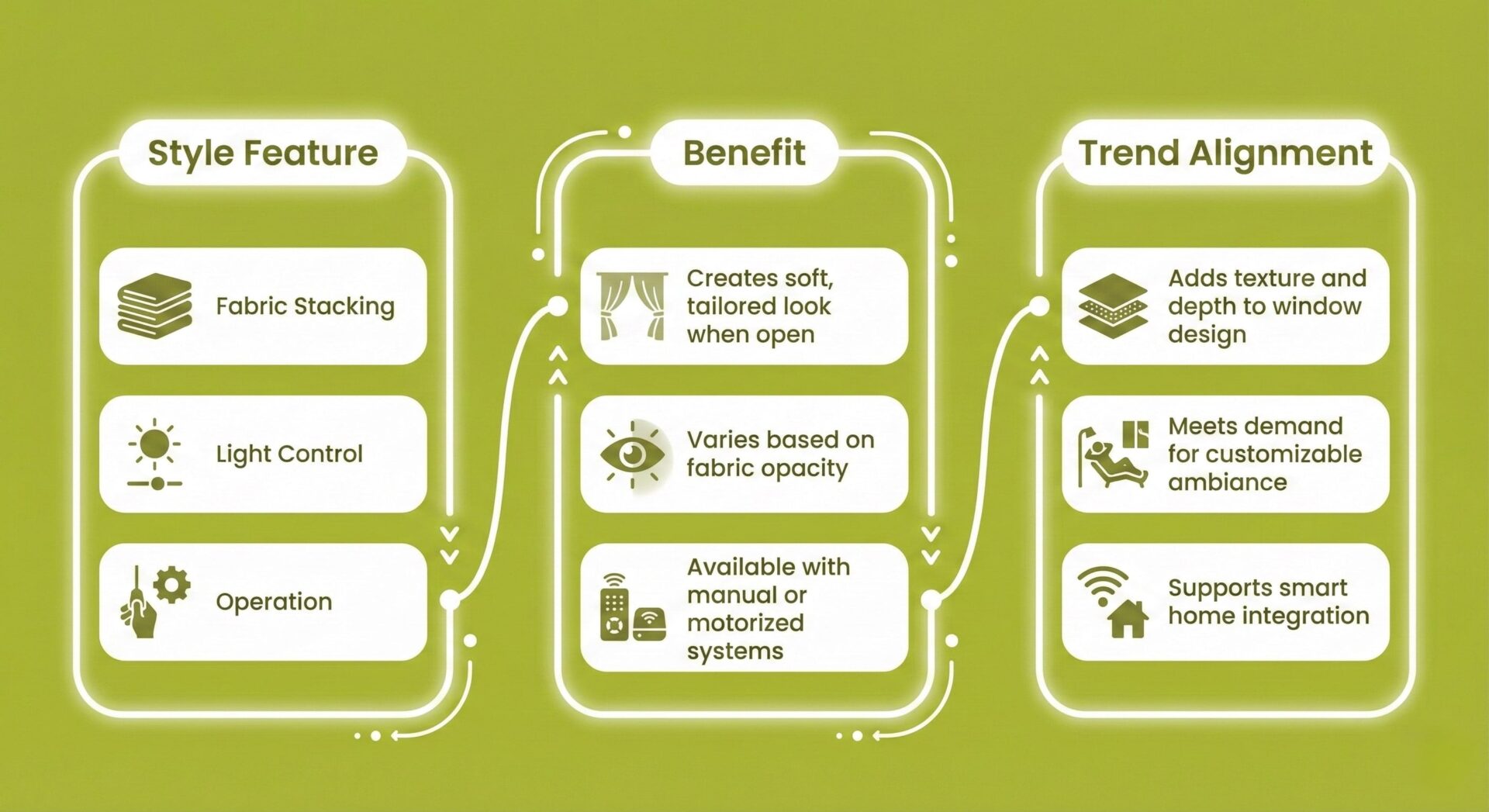 Fabric StackingCreates soft, tailored look when openAdds texture and depth to window design