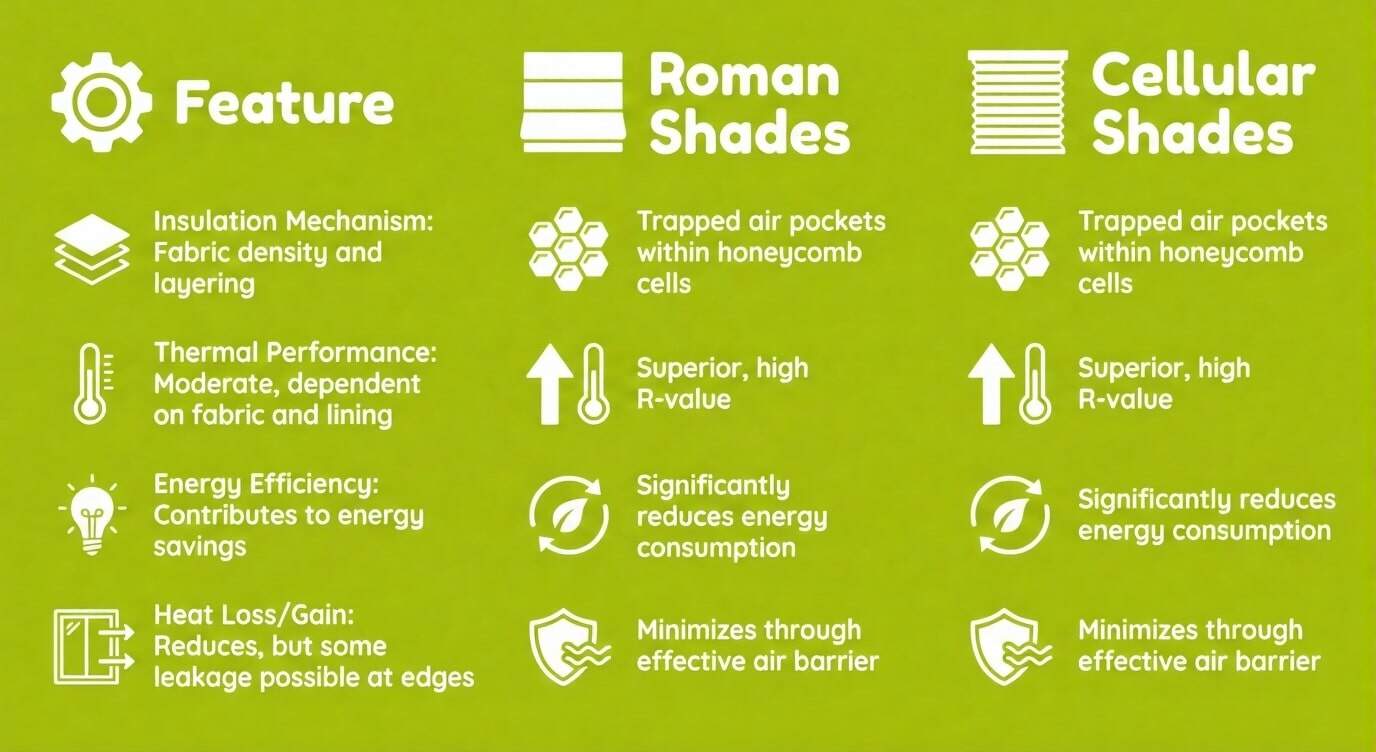- Roman Shades primarily insulate through fabric density and multiple layers, offering moderate thermal benefits.