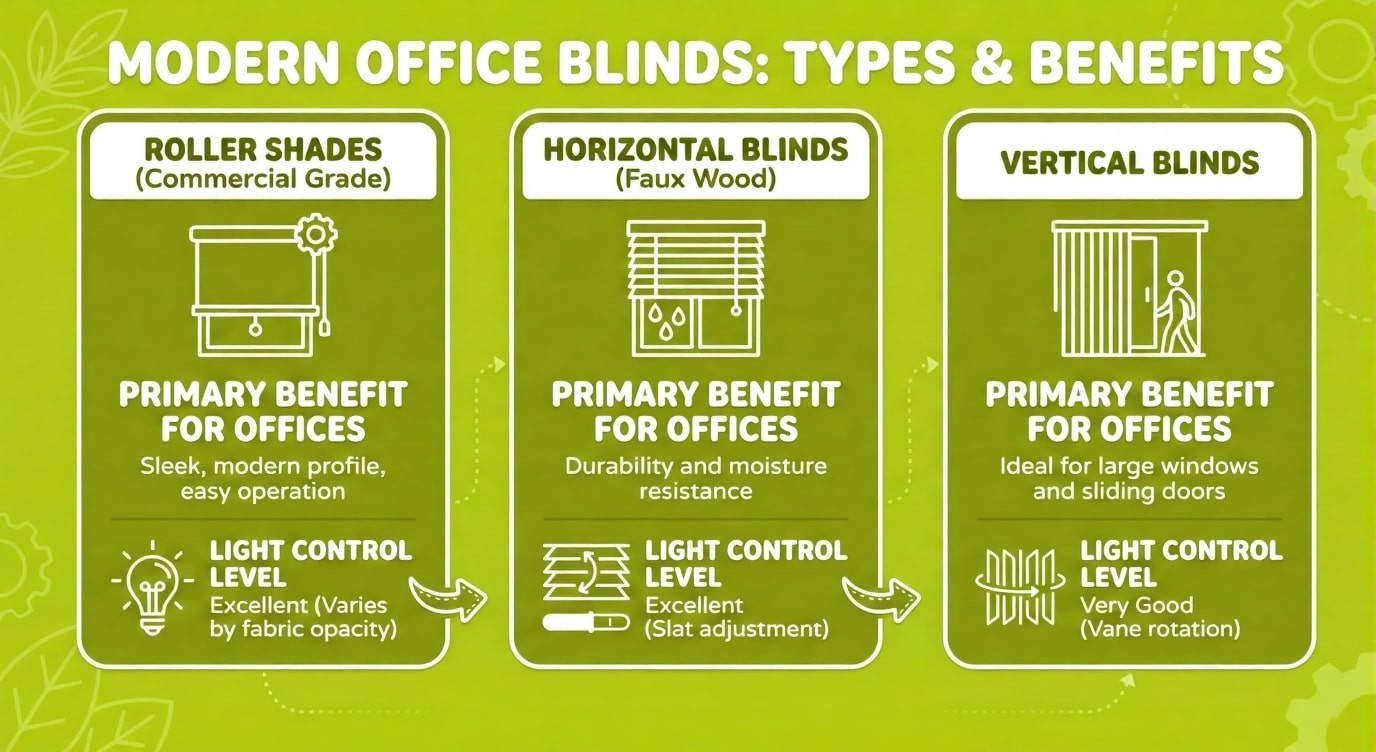| Blind Type | Primary Benefit for Offices | Light Control Level |