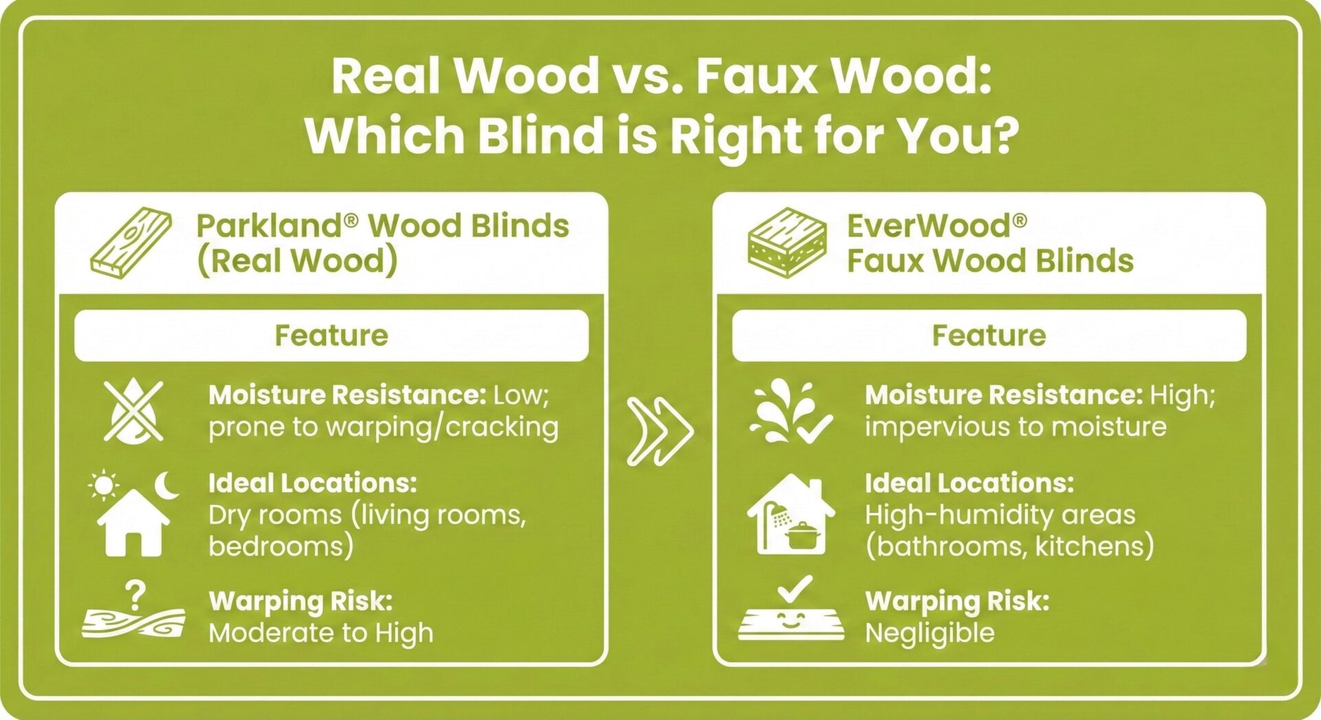 | Feature | Parkland® Wood Blinds (Real Wood) | EverWood® Faux Wood Blinds |